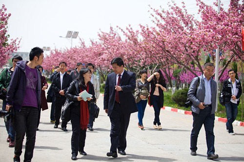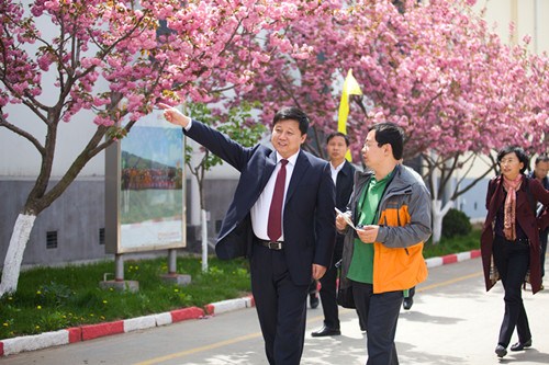 (資深總裁李瑞寒陪中央媒體采訪團欣賞工廠美景)