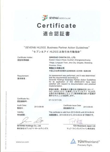 據(jù)客戶介紹,本次國(guó)內(nèi)有七家企業(yè)參加此項(xiàng)CSR認(rèn)證,僅兩家通過(guò),一家是河北規(guī)模較大的板栗生產(chǎn)企業(yè),另一家就是青島正大有限公司。 |