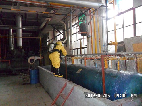 2012年7月6日,公司設(shè)備部、安全部聯(lián)合組織了液氨泄漏應(yīng)急演習(xí)。